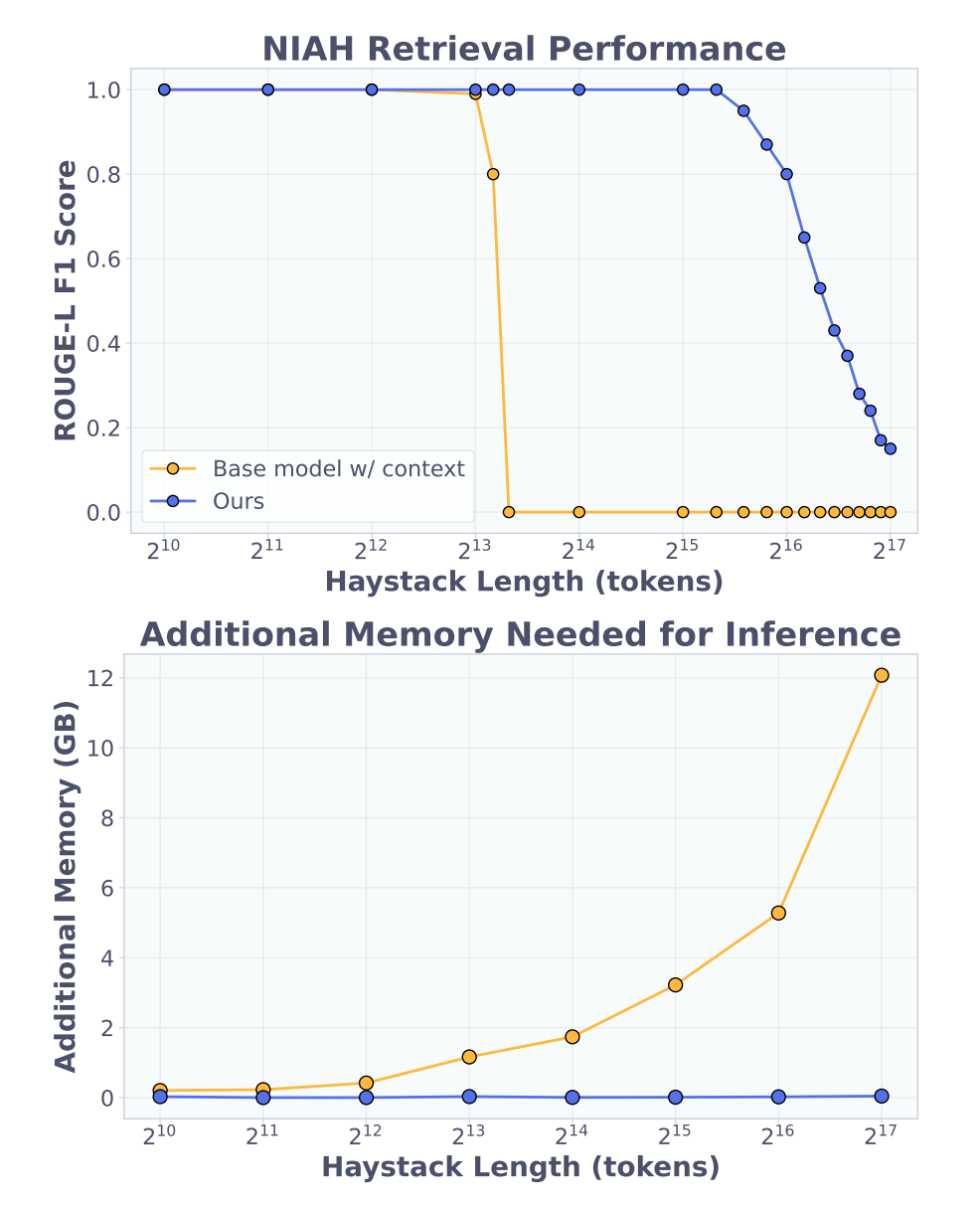 〓 高达 128K 超长上下文的大海捞针测试中,基础模型与 Doc-to-LoRA 在准确率及推理内存需求上的对比曲线。