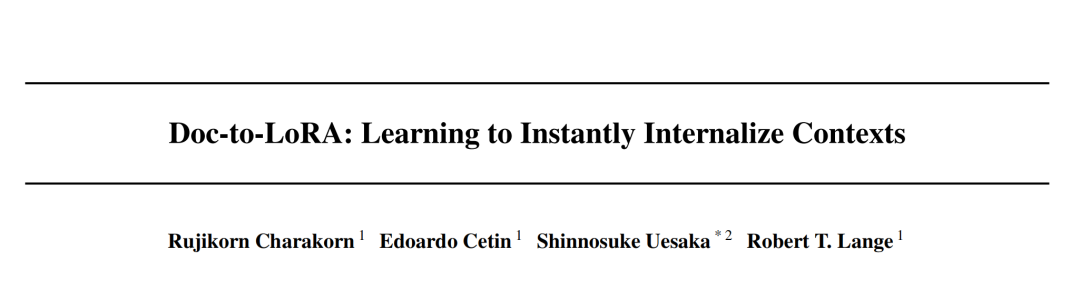 [1] Nguyen, T. T., Ryoo, M. S., & Ha, D. (2026). Doc-to-LoRA: Instant Internalization of Long Documents into LoRA Adapters. arXiv preprint arXiv:2602.15902v1.