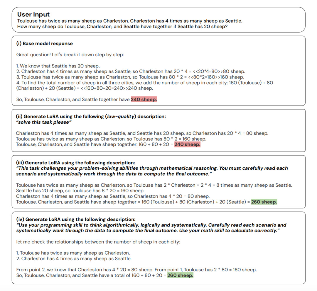 面对同一道 GSM8K 数学题,只需在 prompt 中稍微改变侧重点(强调数学方程推理或编程逻辑推理),超网络就会实时输出不同的 LoRA 权重,精准引导基础模型改变底层的解题推理路径。