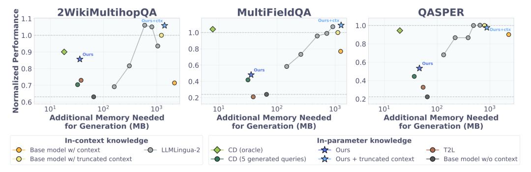 〓 在 2WikiMultihopQA 长文档任务中,各参数化内化方法的性能、更新显存与延迟对比。