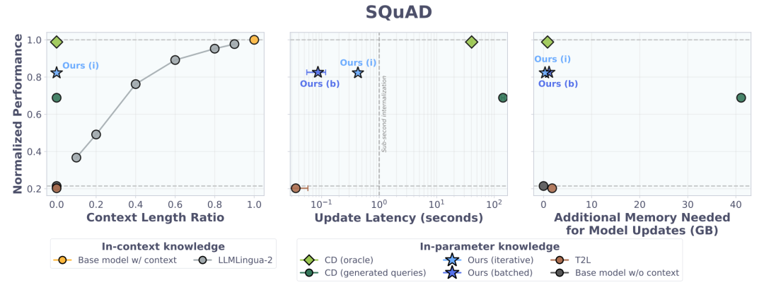 在 SQuAD 短文本问答评测中,Doc-to-LoRA 成功实现了知识内化,达到了上下文学习(ICL)性能上界的 82.5% 相对性能。