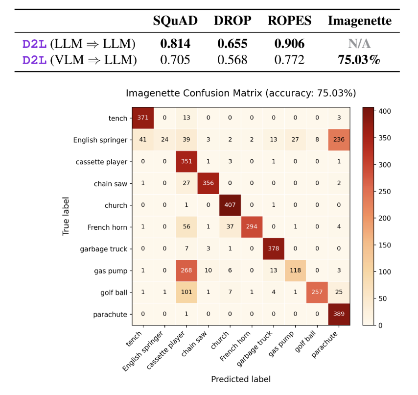 推理时,仅凭接收视觉语言模型(Gemma-3-4B-it)提取的视觉激活值,超网络便直接为纯文本模型生成了具备视觉分类能力的 LoRA 权重,在 ImageNette 数据集上取得了 75.03% 的分类准确率。