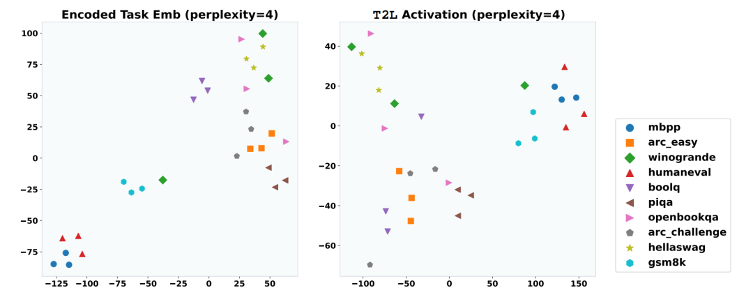 〓 任务编码器激活值的 2D t-SNE 聚类可视化,展示模型在未见测试任务(如 MBPP、BoolQ)上隐式学习到的清晰特征簇。