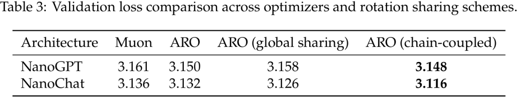 对称性关系揭示了跨层、跨模块之间的耦合约束。例如,受同一段残差流支配的矩阵(如某一层的 QKV 和上一层的输出投影)理当绑定同一个旋转。这提供了一种经济利用跨层相关性的途径 —— 不是通过暴力计算全局二阶矩,而是通过架构自身的耦合关系绑定旋转。在小规模模型上初步验证:跨层绑定旋转不仅能降低计算开销,还显著提升了优化性能。