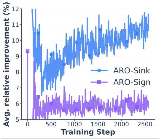 它的直觉很简单:ARO 是在拿上一轮旋转后的基座优化器更新量,寻找新的旋转去大概 “对齐” 原始的梯度动量。换句话说,ARO 在主动地去寻找一个能让当前优化器 f 发挥得更好的旋转角度。实验发现(图 1),用 ARO 的更新方向,比基于传统特征旋转的更新,能带来更优的瞬时损失下降率 —— 该优势在整个训练过程中持续存在。