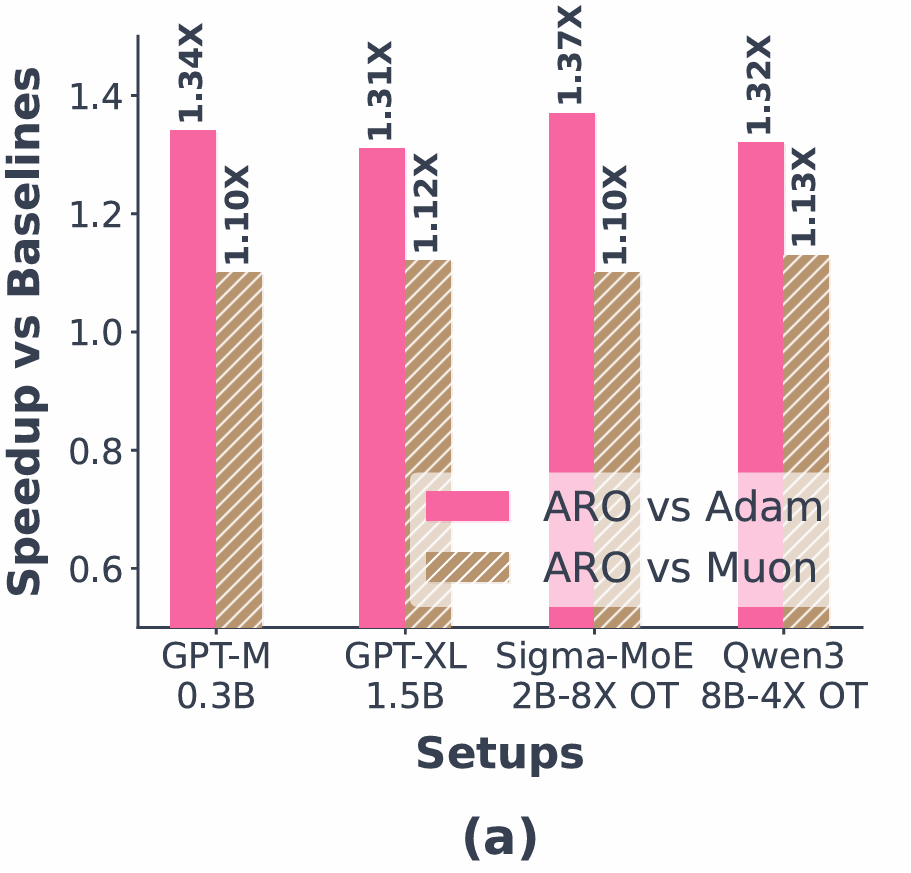 规模化实验将 ARO 推向更大场景:架构覆盖稠密和 MoE,规模从 3 亿延伸至 80 亿激活参数,训练预算拉到 1-8 倍 Chinchilla 过训练。结果显示(图 3),ARO 对 AdamW 保持约 1.3-1.35 倍加速,对 Muon 等正交化方法保持约 1.1-1.15 倍加速,且加速比在更大规模、更长周期下未见衰减。同时,作者通过工程优化使得 ARO 在大规模分布训练下的额外开销相比 AdamW 控制在 3% 以内。