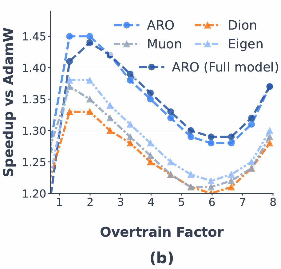 通过严格控制的大规模训练, ARO 将大语言模型的训练效率相对 AdamW 提升了约 1/3(额外时间开销压在 3% 以内),比 Muon 还要高效 10%~15%,且在最多 80 亿参数、多倍过训练的压力测试下,未出现收益递减迹象。