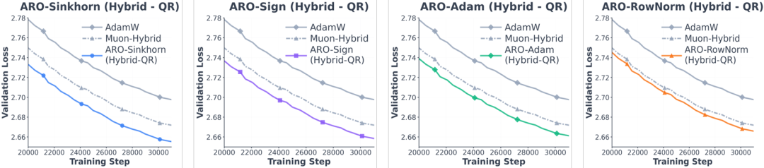 论文在 Sigma-MoE-2B 里对比了几种设置:混合(ARO 只优化隐藏层)、全模型(ARO 优化所有矩阵参数)。结果表明(图 4),全模型模式的 ARO 在训练后期(3 倍 - 4 倍过训练之后)反而比混合模式效果更好。