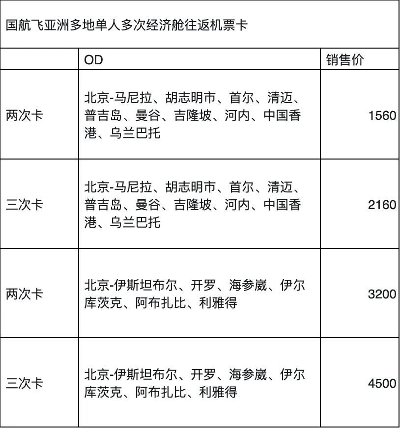 1、国航-北京出发,国际单人多次经济舱往返机票卡,不含税1560元起