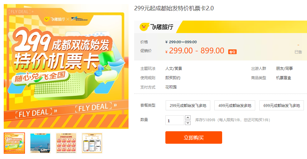 8、飞猪-海南专属机票单次卡,不含税299-300元