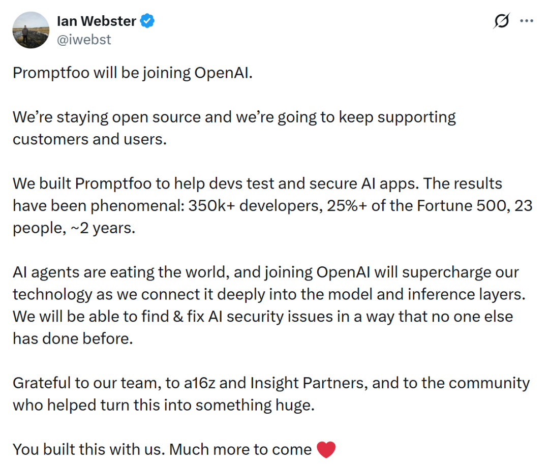 本次收购的具体金额当前并未被披露,但 OpenAI 表示 Promptfoo 团队将加入 OpenAI。Promptfoo 首席执行官 Ian Webster 在一份声明中表示,“随着 AI 智能体与真实数据和系统的连接日益紧密,对其进行安全防护与验证变得比以往任何时候都更具挑战性,也更为重要。加入 OpenAI 能让我们加速推进这项工作,为构建实际落地 AI 系统的团队提供更强的安全、保障与治理能力。”