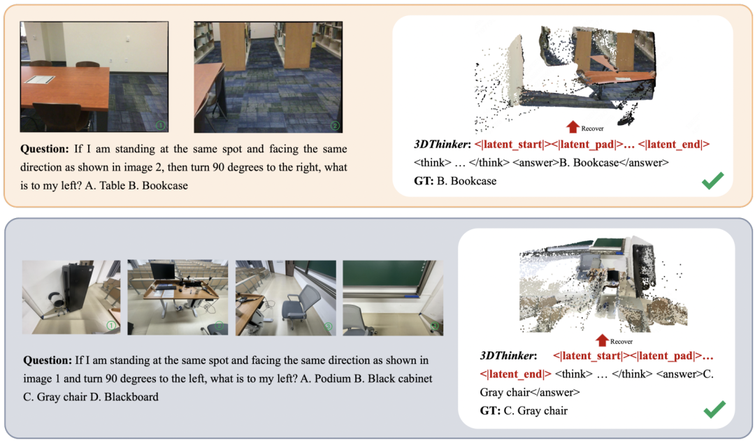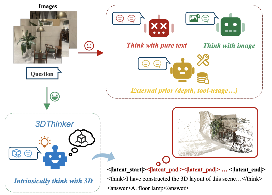 而 3DThinker 提出了一种全新的思路,在无需 3D 标注(例如点云)、无需外部工具的情况下,让模型在推理过程中内蕴地「想象」三维场景。