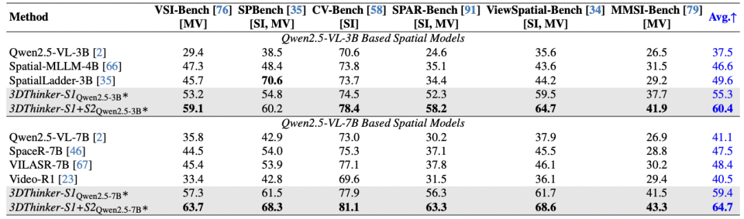 以 Qwen2.5-VL-3B 为例,该方法相比之前的 SOTA +10.8 pp(49.6->60.4);以 Qwen2.5-VL-7B 为例,该方法相比之前的 SOTA +16.3 pp(48.4->64.7)。结果显示,3DThinker 提升到一个新的水位,在各类基准上均出现了显著提升的迹象。
