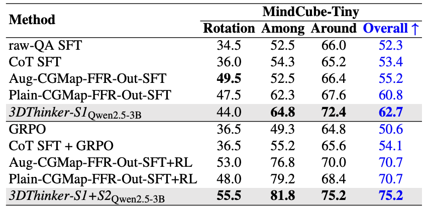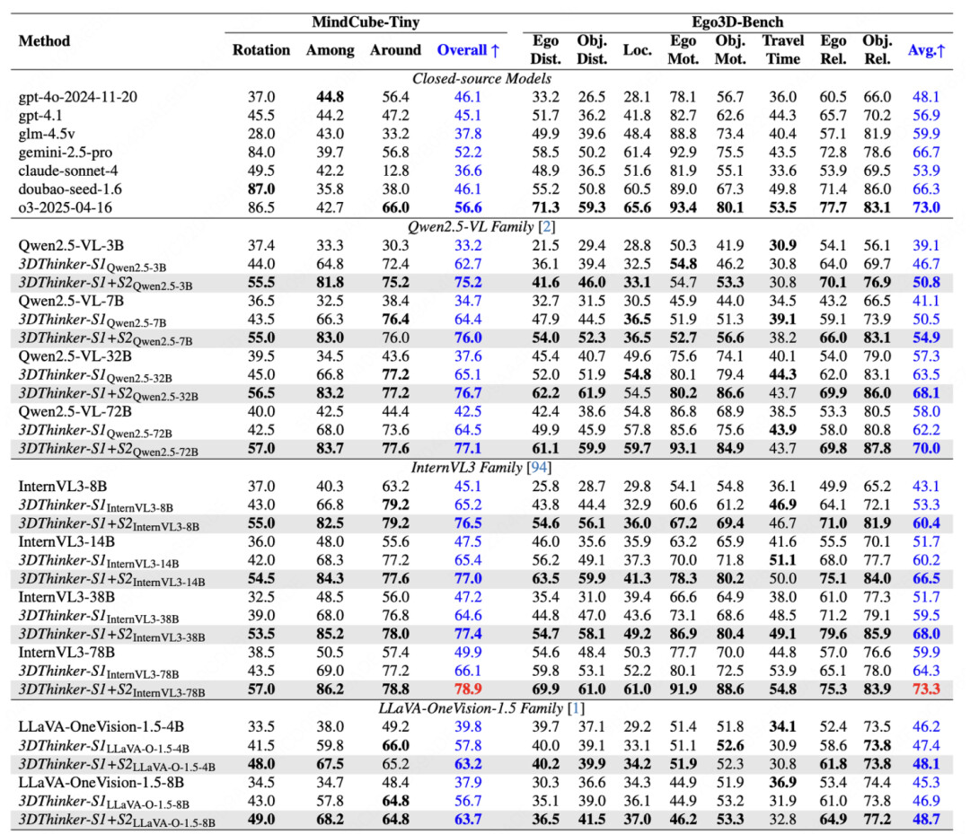 方法首先在 MindCube 的 10K 数据上构造了带有 3D special token 的推理链数据,并基于两个阶段进行训练,下表报告了训练后的模型效果,在 MindCube-Tiny 上,针对不同尺寸的模型,相比 base 整体提升了 51.8% 到 108.8%;在 Ego3D-Bench 上,则提升了 18.1% 到 36.9%。