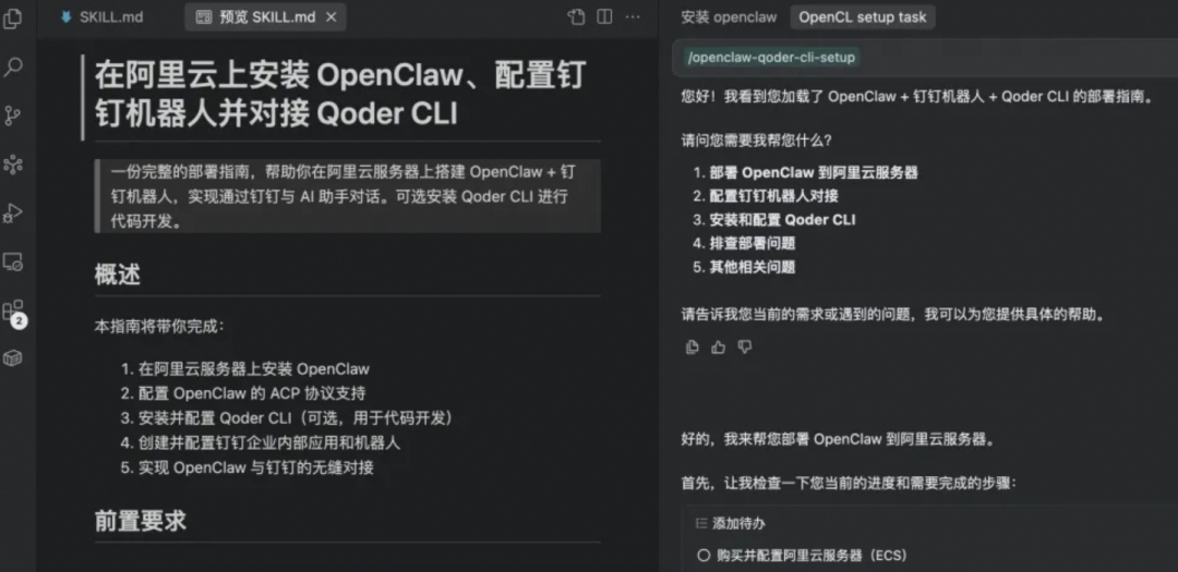 养虾的人分两种:一种自己蹲塘口,一种让 AI 蹲。有人花三天折腾服务器环境、配钉钉机器人、对接各种协议,虾还没养起来人先累趴了。而另一种人,把一个 Skill 文件丢给 Qoder,说了句"帮我装",然后去泡了杯茶。茶还没泡好,虾塘已经跑起来了。
