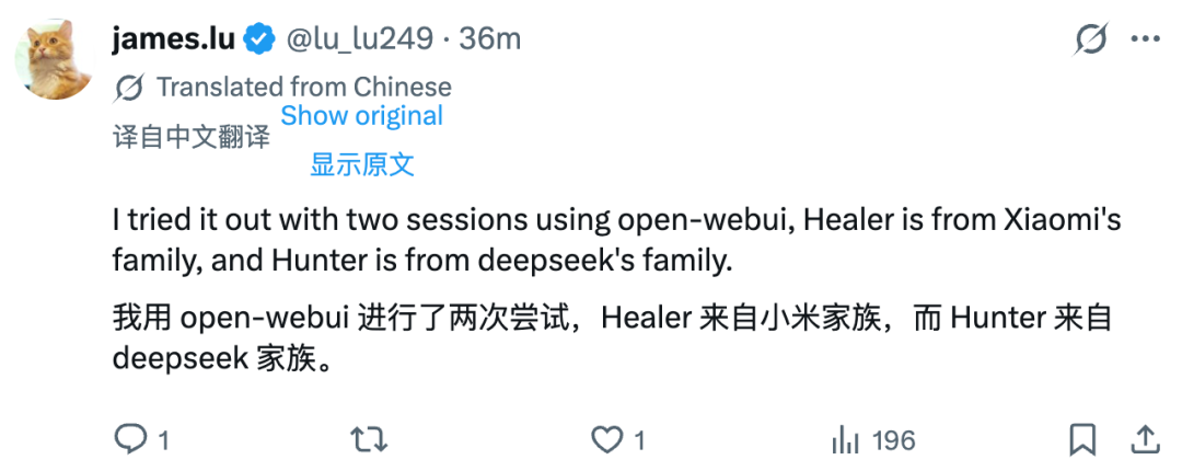 有人在通过 open-webui 实测之后猜测,「Hunter Alpha 可能来自 DeepSeek,Healer Alpha 可能来自小米(mimo 系列)。」