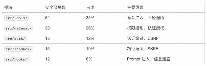 Critical 与 High 合计 50 个,约占明确安全修复的 34%。按代码模块分布,风险高度集中在入口与执行层: