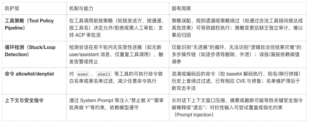 OpenClaw 在架构上提供了多道预防性控制(Preventive Controls):工具策略管道(Tool Policy Pipeline)在调用前做策略决策、Owner-only 封装对敏感操作做权限绑定、循环检测器识别无进展的会话、命令 allowlist/denylist 限制可执行命令集合。这些机制在正常配置下能有效缩小攻击面,但从安全工程角度看,它们属于同一信任域内的执行时校验,存在以下固有局限: