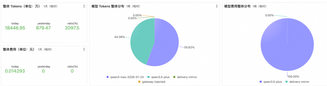 整体概览:今日 vs 昨日的 Token 与费用环比,日环比突破阈值(如 ±30%)是成本异常的第一道信号;
