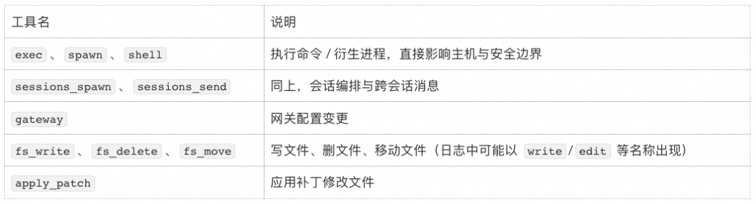 在 Session 日志中监控上述工具(及其在日志中的等价名称)的调用,可发现异常或越权行为;若某工具在 Gateway HTTP 场景下仍被调用成功,则可能存在配置绕过,需排查。
