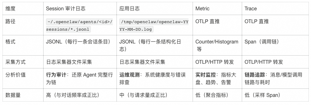 三支柱缺一不可:仅有 Metrics 无法回答"谁、因何"导致成本飙升;仅有 Session 日志无法从全局感知系统健康与异常拐点;仅有应用运行日志则看不到 Agent 的业务行为与工具调用序列。三者协同才能同时支撑安全审计、成本管控与运维排障。