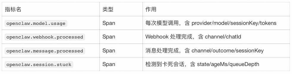 OpenClaw 通过 OTEL 导出的数据覆盖四个观测维度: