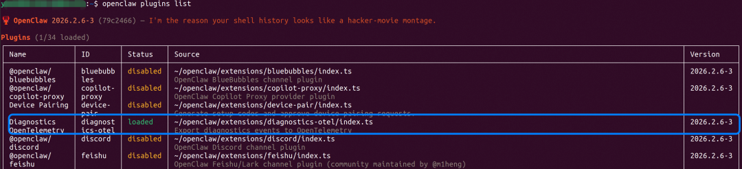 执行命令 openclaw plugins enable diagnostics-otel启动插件,通过 openclaw plugins list 命令查看插件状态,预期状态为 loaded。