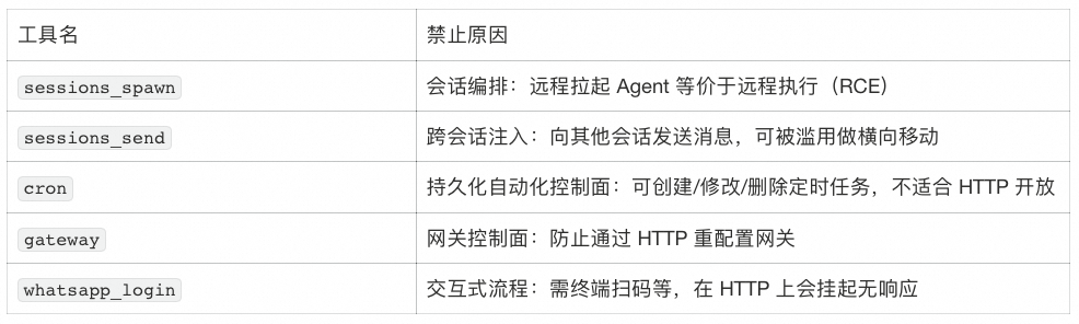 通过网关 POST /tools/invoke 调用时,以下工具默认拒绝,因为它们在非交互的 HTTP 面上风险过高或无法正常完成: