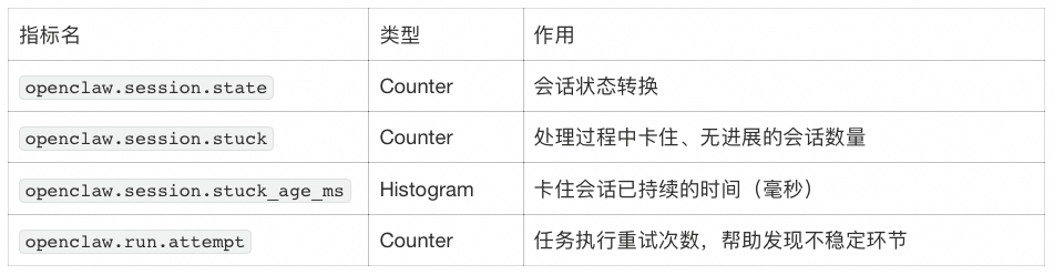 OTEL 指标与链路回答「当前状态与耗时」,通过 Token 消耗增速、会话卡死、Webhook 错误率、队列积压等指标实现实时告警