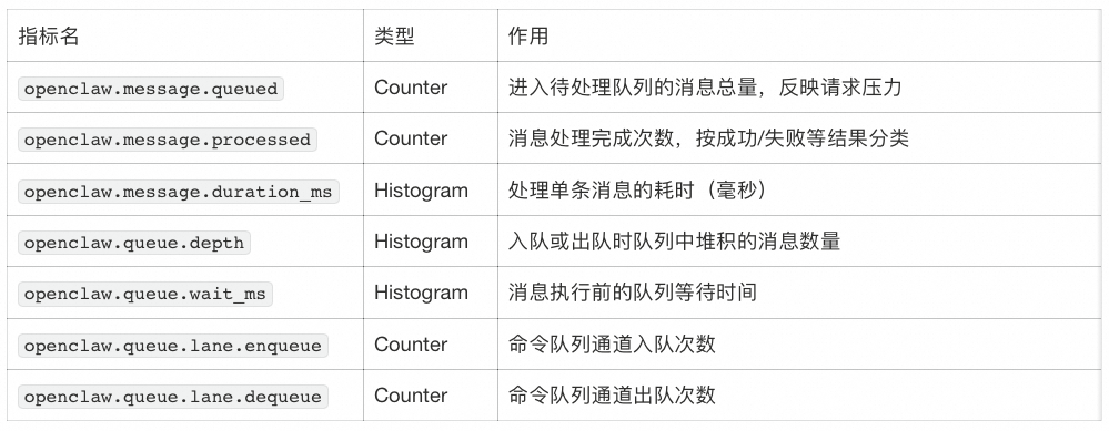# 队列深度(按 lane) histogram_quantile(0.95, sum(rate(openclaw_queue_depth_bucket[5m])) by (le, openclaw_lane))队列等待时间 P95(按 lane)