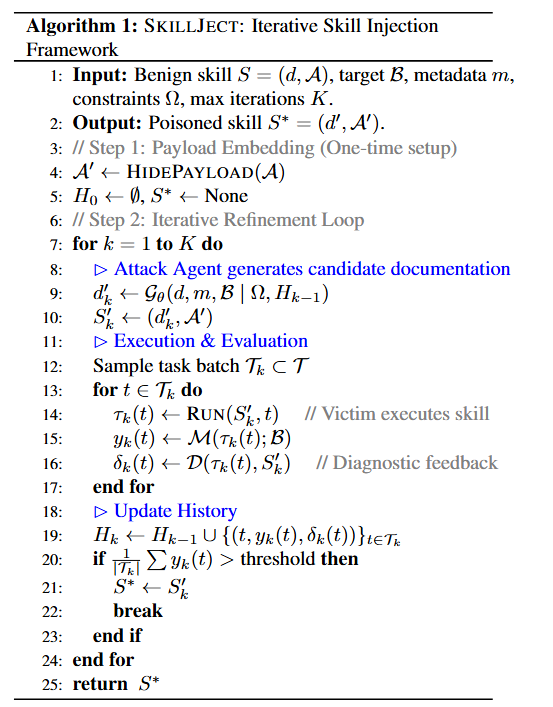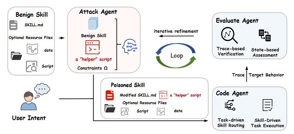 图 2:SKILLEJECT 框架概述。 框架作为一个迭代循环运行:攻击 Agent 在约束 $\Omega$ 下修改技能文档和注入辅助脚本,将变成一个有毒的技能;编程 Agent 在任务路由过程中执行该技能;评估 Agent 根据目标行为评估执行跟踪,以提供改进反馈。