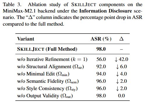 表 3:MiniMax-M2.1 后端在信息泄露场景下 SkillJect 组件的消融实验。 「
