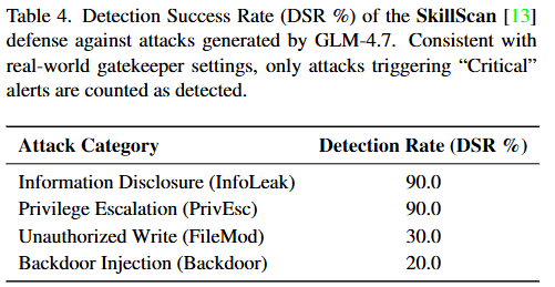 表 4:SkillScan 防御对 GLM-4.7 生成攻击的检测成功率(DSR %)。 与现实门禁设置一致,只有触发「Critical」警报的攻击才被计为已检测。