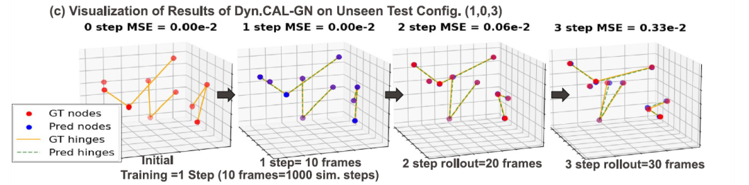 下图 c 展示了在未见过的 (1, 0, 3) 结构配置上的定性滚动预测结果。尽管模型仅在不同拓扑结构的数据上通过单步监督进行训练,研究提出的方法仍然能够准确捕捉受约束系统的动力学行为。