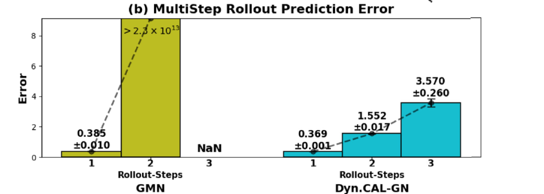 下图 b 表明:尽管模型仅使用单步监督进行训练,DYNAMI-CAL GRAPHNET 在多步滚动预测中仍能保持稳定精度,而 GMN 很快出现发散。