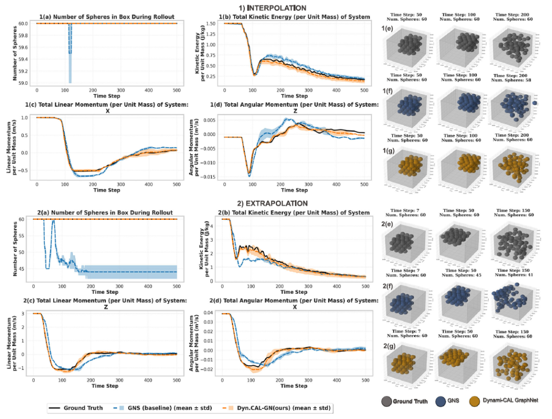 DYNAMI-CAL GRAPHNET成功保留所有粒子,准确跟踪动能衰减,在 500 步预测中保持动量演化一致,在不同随机种子下方差很小。与之相比,GNS 在外推场景中较早发生发散,且出现粒子逃逸。原因是在高动量条件下,碰撞速度增加,需要准确计算冲量接触力才能维持系统约束,而 GNS 无法很好泛化,即使是未逃逸的粒子,其预测也逐渐偏离真实物理行为。