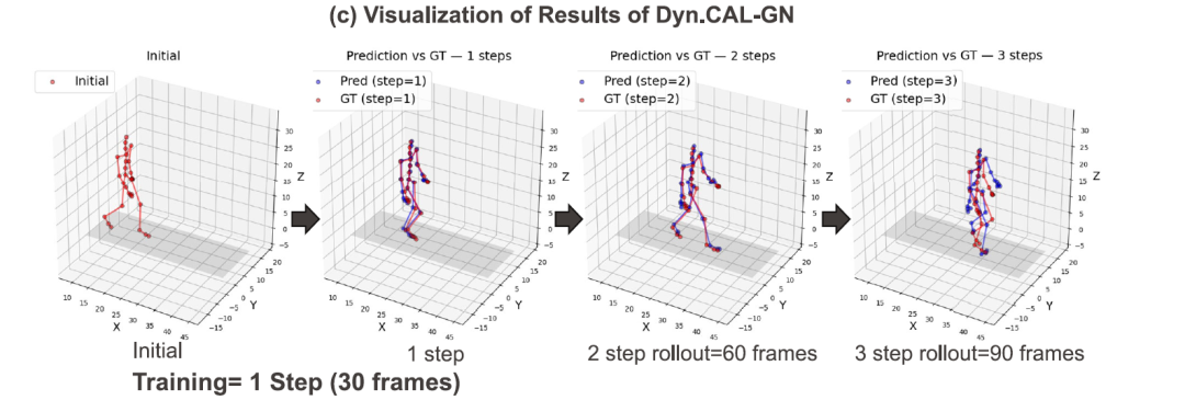 在人体运动捕捉数据上,尽管模型只使用单步监督训练,但在多步预测中仍能保持稳定轨迹,这表明模型成功学习到了人体运动中的时空动力学结构。