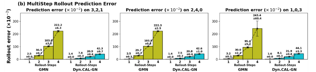 对于多步滚动预测(multi-step rollout prediction),下图 b 将 DYNAMI-CAL GRAPHNET 与 GMN 进行了比较。结果表明,在最长 4 步的多步滚动预测(其中 1 步 = 10 帧 = 1000 次仿真步)中,DYNAMI-CAL GRAPHNET 能够保持稳定的长期预测精度;而 GMN 的预测误差则会随着时间逐渐累积并显著增大。