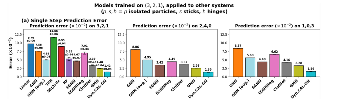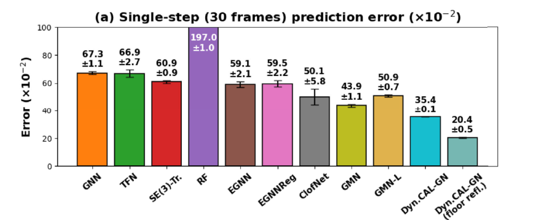 这些结果表明:DYNAMI-CAL GRAPHNET 在建模耗散型、接触密集的 6-DoF 动力系统方面具有更强的鲁棒性与泛化能力。