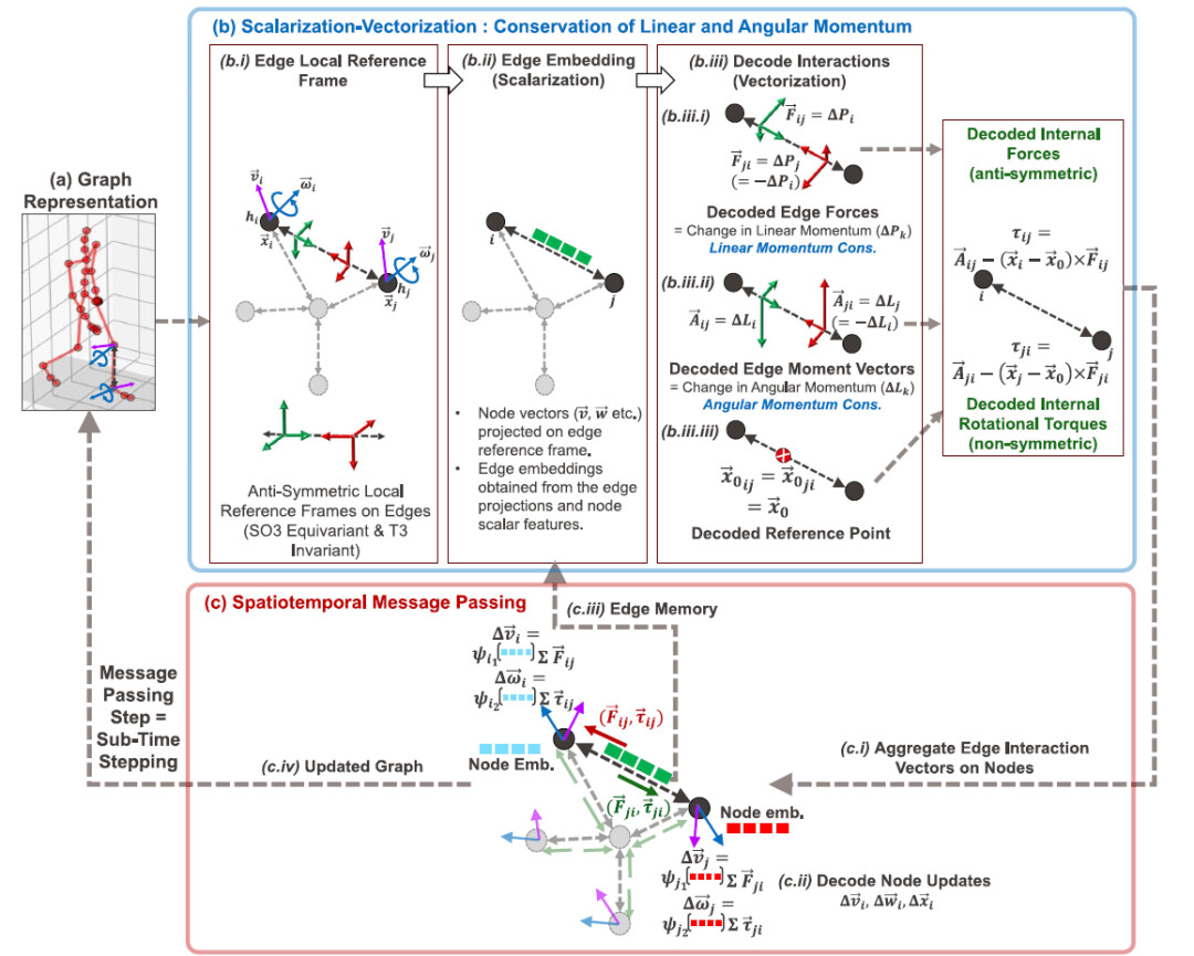 在每条边上计算出物理一致的内部力和力矩之后,模型会执行 DYNAMI-CAL GRAPHNET 的时空消息传递机制。