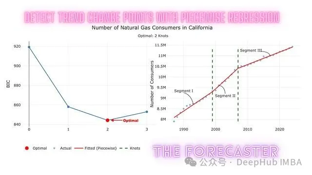 本文展示了如何将变化点检测转化为一个优化问题:通过网格搜索遍历候选节点配置,用惩罚似然准则(BIC)选出最优模型,配合分段回归完成趋势变化点的自动检测。