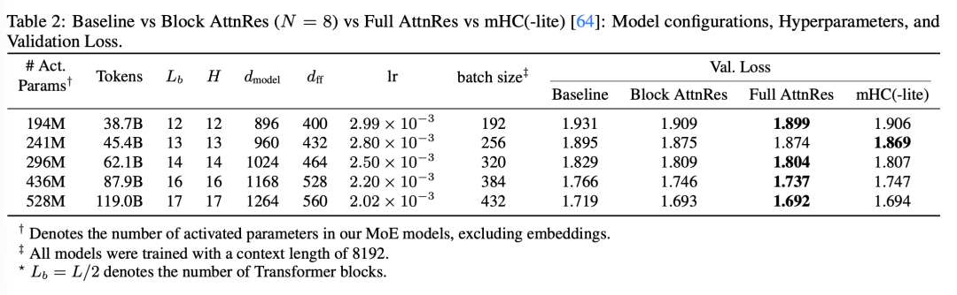 在这种设计下,网络的第一层接收 Token 嵌入;每个块的第一层接收之前所有的块表示及 Token 嵌入;块内的后续层则额外关注当前块内已产生的累加结果。最终的输出层聚合所有 N 个块表示。