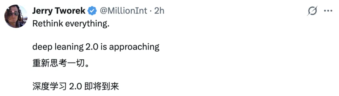 就连 OpenAI 「推理模型之父」,主导了 o1/o3 系列、Codex 编程模型及 GPT-4 的 STEM 能力开发的 Jerry Tworek 都深受这一论文启发,认为应当重新思考之前的一切,「深度学习 2.0」的时代即将到来。
