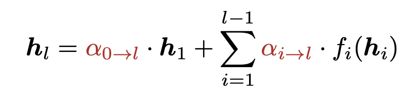 Softmax 权重: 通过 Softmax 归一化,模型可以 「挑选」 出对自己最有用的某几层。比如第 50 层可以直接提取第 2 层的特征,权重占比可以高达 0.8,而不用担心被中间的 48 层稀释。