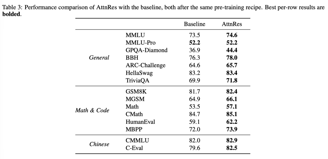 下游性能表现: 如上表所示,Block AttnRes 在所有评测任务中均达到或超过了基准模型。