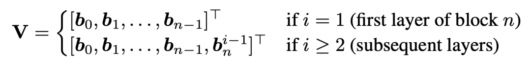 全局调度(Inter-Block): 每一层在进行残差聚合时,不再盯着 「每一层」 看,而是盯着 「每一个块」 看。对于第 n 块中的第 i 层,其 Value 矩阵 定义为: