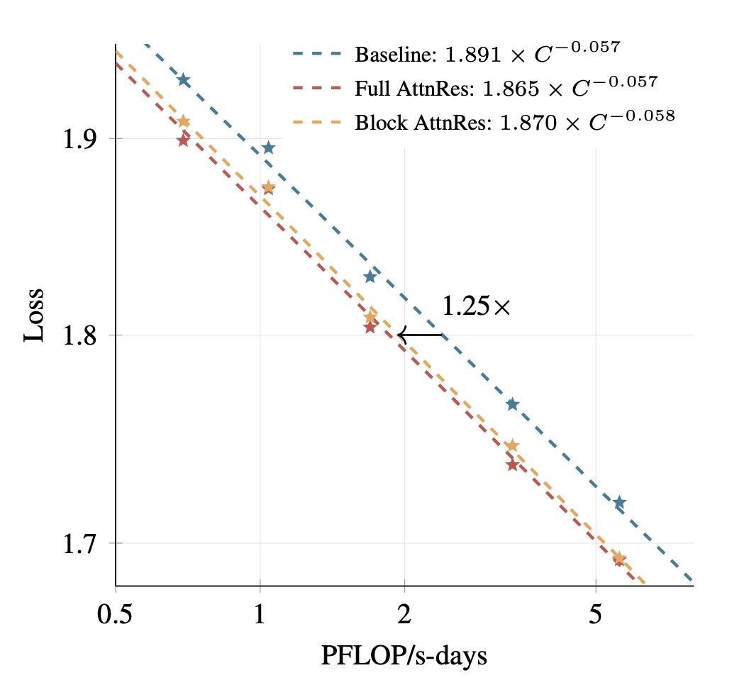 计算效率: 达到同样的性能,AttnRes 相比传统残差节省了约 20% 的计算量(1.25x 优势)。