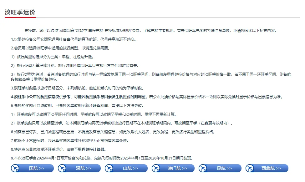 前几天国航公布新一轮淡旺季兑换标准,兑换和飞行日期都是:2026年4月1日-10月31日。