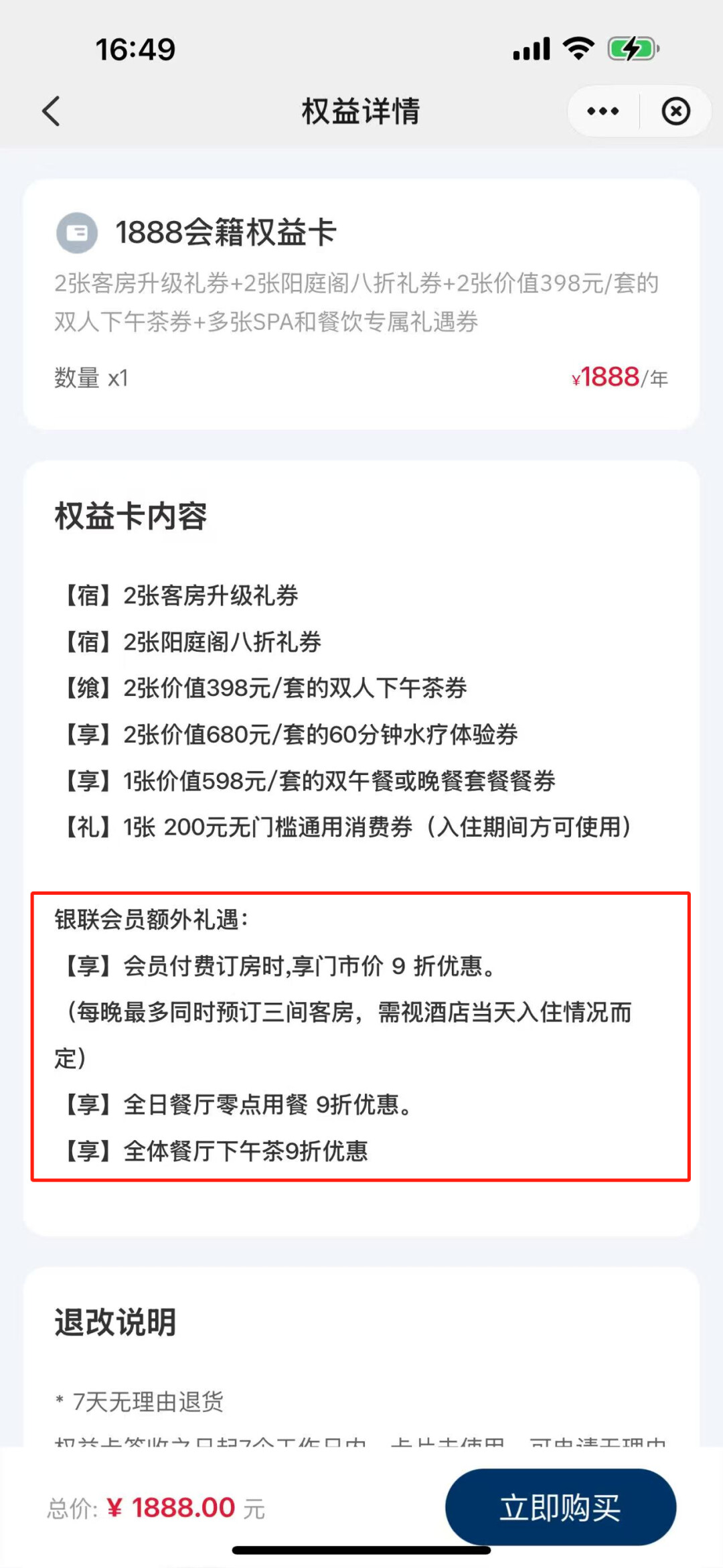 以3988元/年的白金卡为例,给到1晚行政房,平时一晚价格2200+,光是这一张券,就已经回了一大半本!