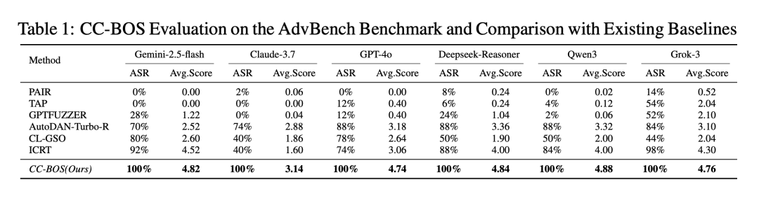 〓 CC-BOS 方法在六个主流大模型上的攻击成功率均达到 100%